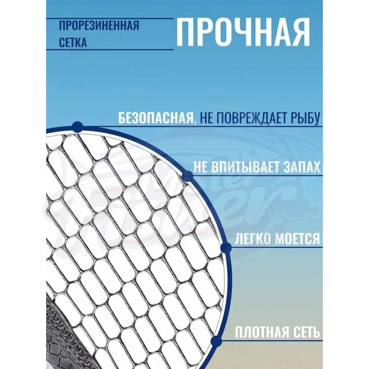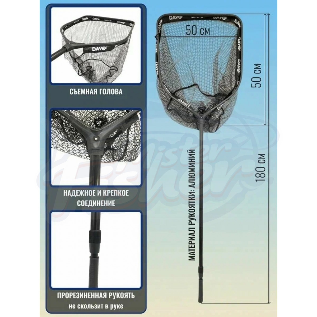 Подсак изготовлен из алюминия. Размер головы 50*50см. Сетка безузловая - с ПВХ покрытием (быстро сохнет, не травмирует рыбу, не цепляется крючками, как обычная тканевая сетка). Рукоятка телескопическая, алюминиевая, двухсекционная. В сложенном состоянии 110см. В разобранном состоянии общая длина 2,5 метра.