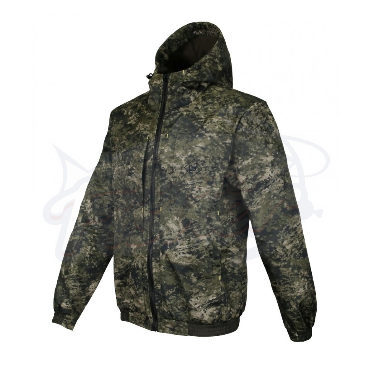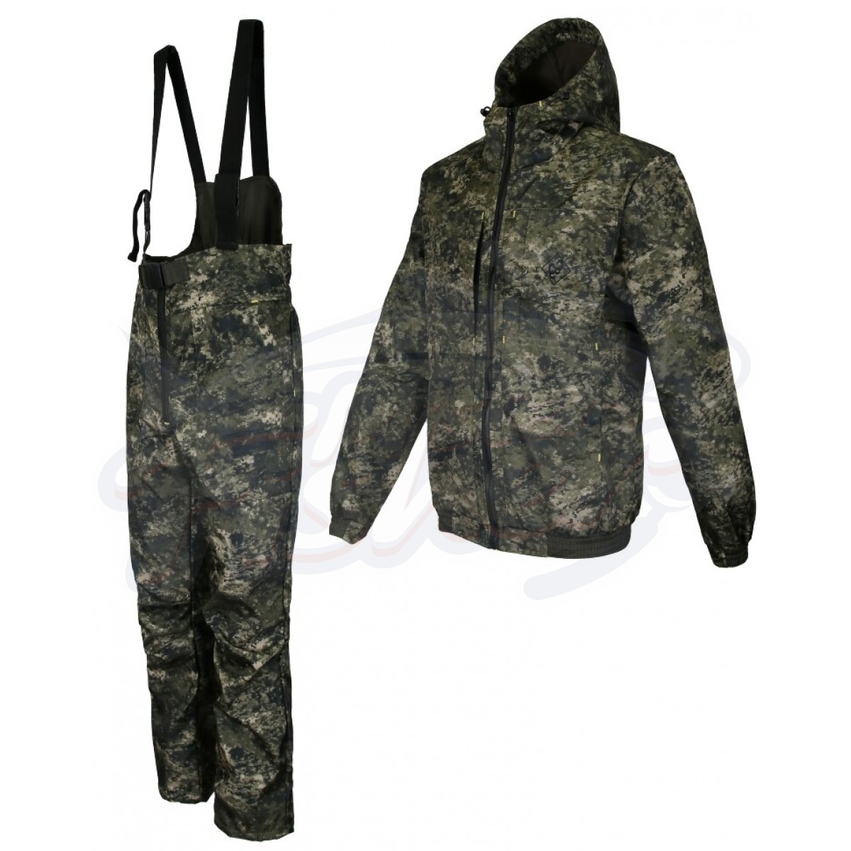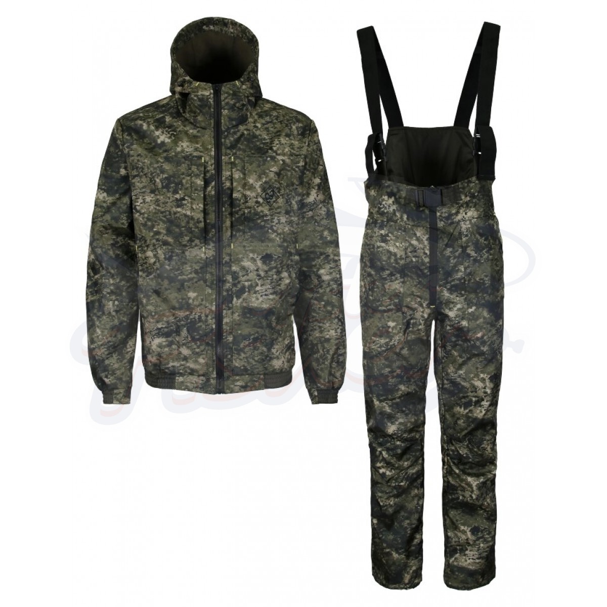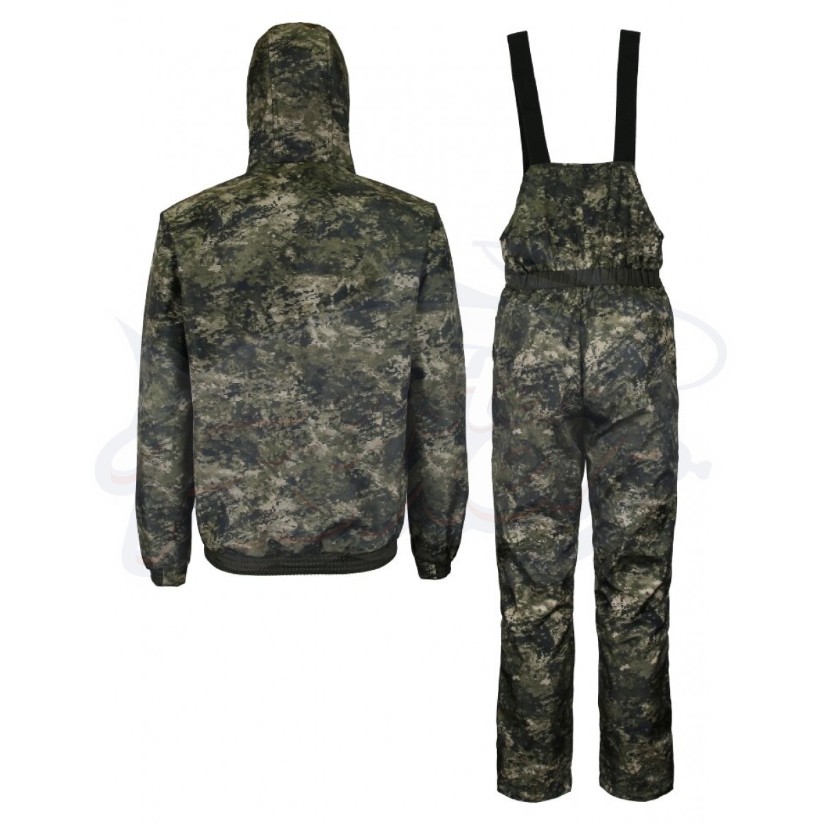 Костюм для рыбалки и охоты демисезонный состоит из укороченной куртки и полукомбинезона.