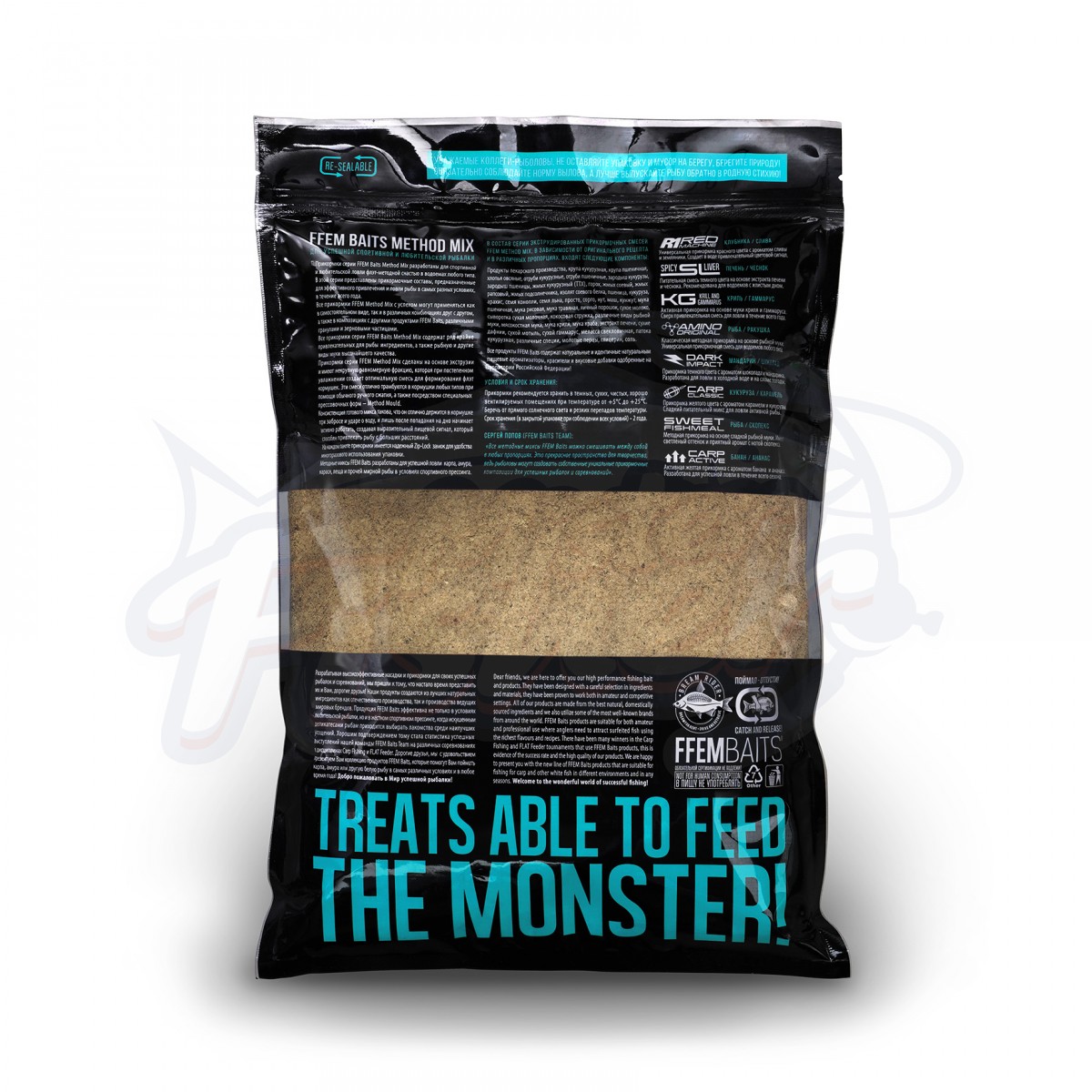 FFEM Method Mix Sweet Fishmeal - питательная HNV (High Nutritional Value) прикормка на основе экстракта печени и рыбной муки. Предназначена для ловли на Feeder и Flat-Method Feeder. Также может использоваться в качестве компонента для приготовления Spod-миксов, PVA мешков и стиков.