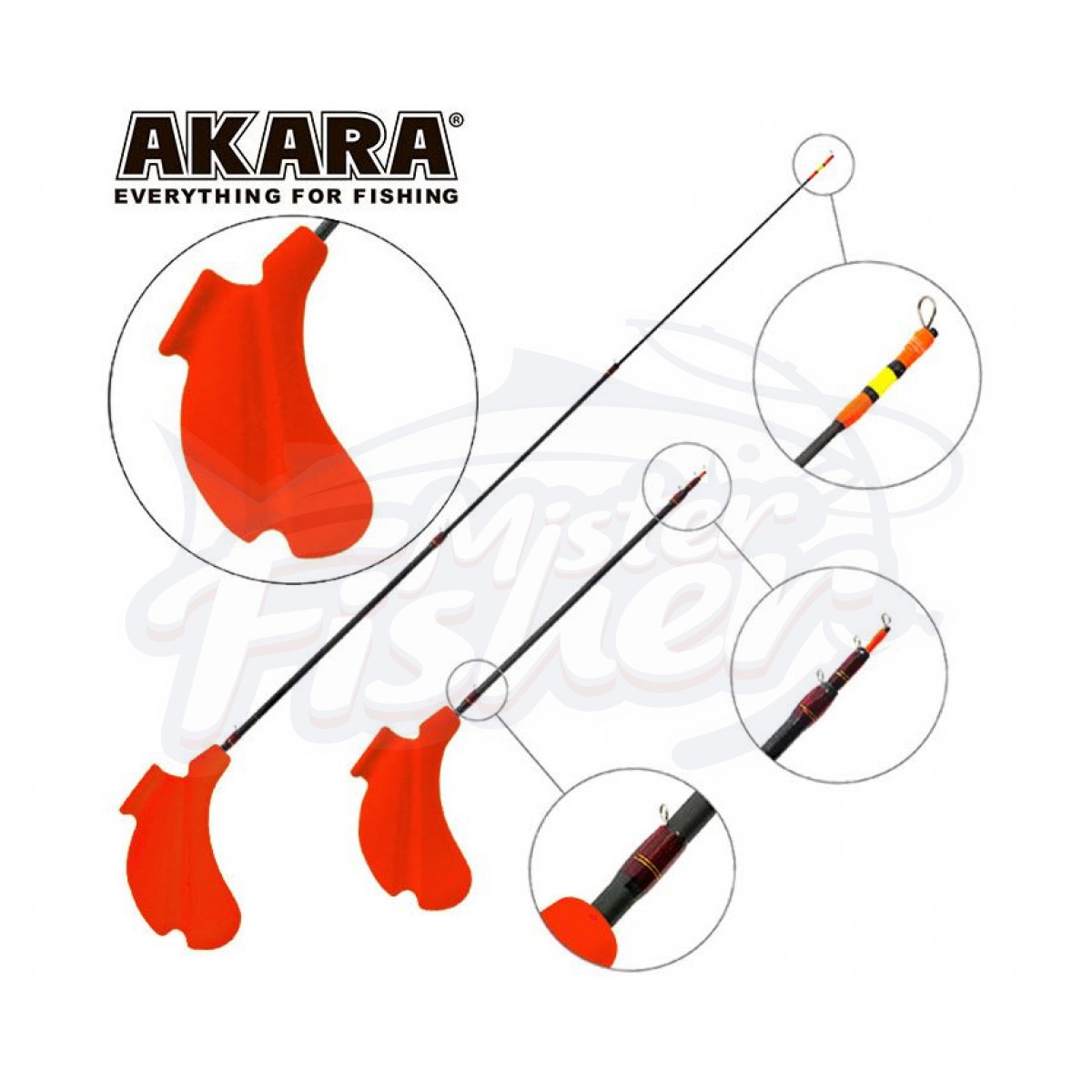 Akara - представляет серию облегченных удильников для ловли на блесну. Удочка выполнена из твердого пенопласта и покрашена в яркие цвета для видимости на снегу. Особенность удочки в том, что она не имеет катушки, леска наматывается на мотовило ручки. При определенном опыте леска на такой удильник подматывается с такой же скоростью, как и на удильник с катушкой. Для точной настройки глубины и фиксации лески во время ловли на корпусе расположено еще одно дополнительное, маленькое мотовило. Во время ловли кисть руки охватывает корпус удочки и не дает леске самопроизвольно соскакивать. При переходе от одного района лова в другой, леску можно наматывать на мотовило не теряя глубины ловли. После перехода удочка опускается мотовилом вниз и под весом блесны леска самопроизвольно сбрасывается с удильника. Это очень удобно и быстро. Хлыстик изготовлен из легкого и прочного монолитного углепластика.